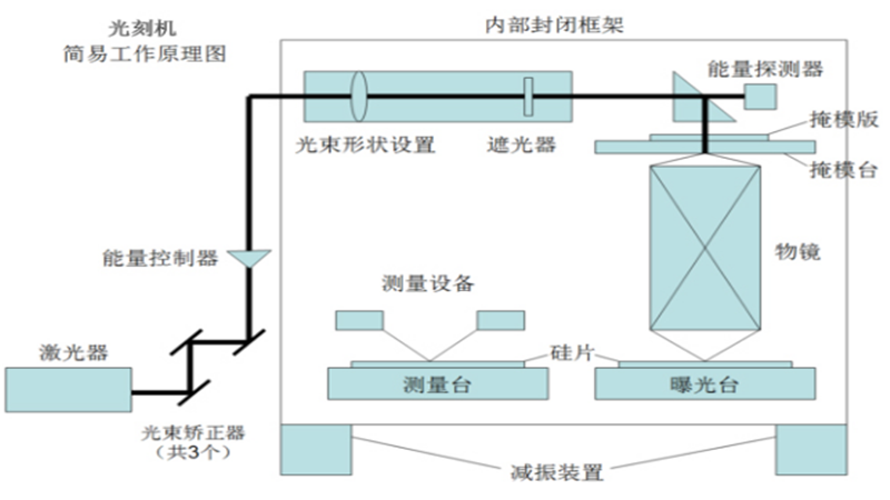光刻機一般是用在激光上,下面以在玻璃上刻蝕圖形為基礎(chǔ),介紹光刻機的工作原理: