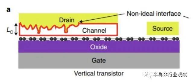 更重要的是,這種垂直場(chǎng)效應(yīng)晶體管不是平行排列的,是垂直排列的。這種縱向的結(jié)構(gòu)具有天然的短溝道特性,半導(dǎo)體溝道位于底電極與頂部電極之間,溝道長(zhǎng)度僅取決于材料厚度。